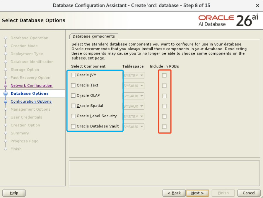 - When you reach the Database Options page, select the components you need in the root container (blue box). In the Include in PDBs list, select only the component you need in all your PDBs. Otherwise, leave them out so you get a lean PDB. You can easily add components later on.