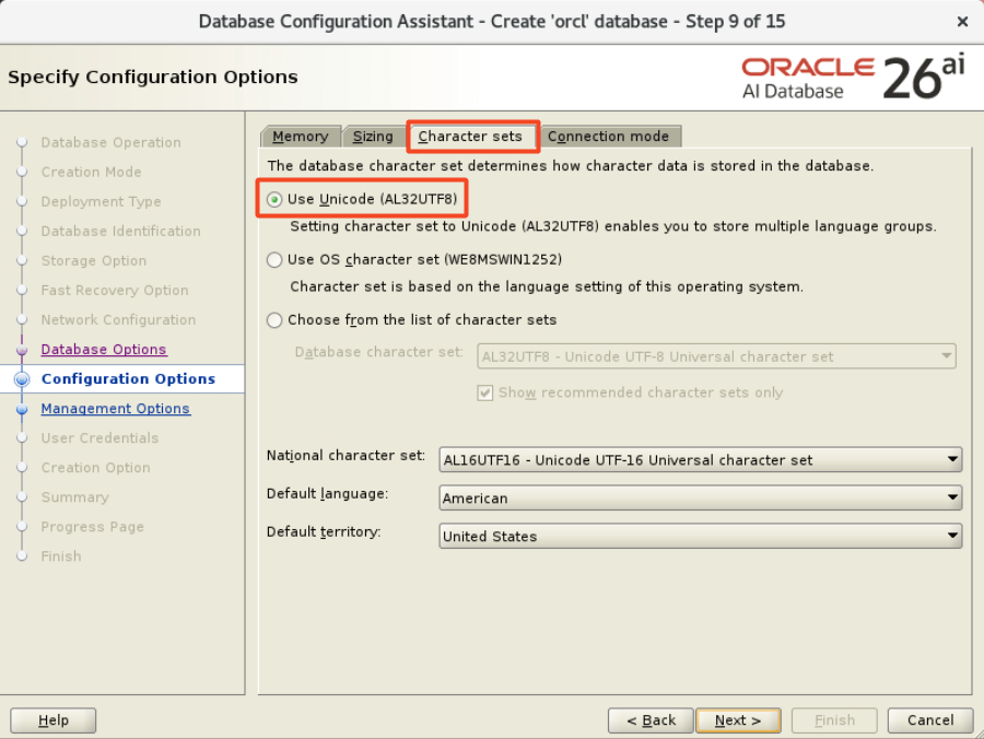 - On the Configuration Options page, on the Character sets tab, ensure that you select Use Unicode (AL32UTF8).