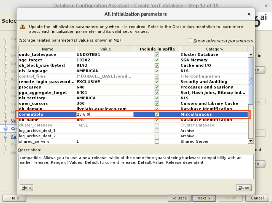- On the Creation Option page, click on All initialization Parameters, and select the compatible setting you use. I recommend using the default.